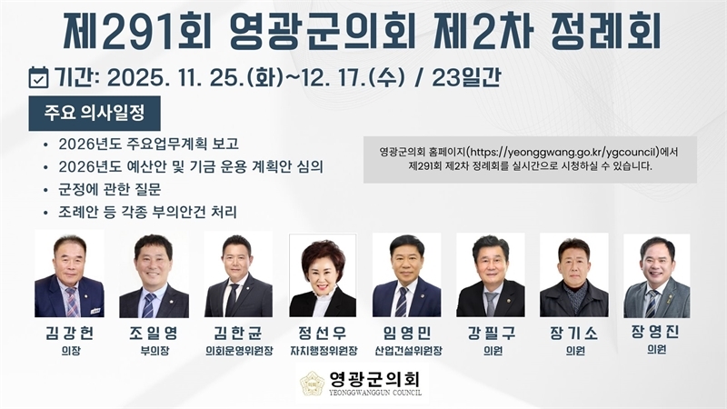 한편, 함평군의회는 12월 3일부터 15일까지 2026년도 예산안 및 기금운용계획안 심사를 진행하며, 최종 의결은 오는 12월 16일 열리는 제3차 본회의에서 이뤄질 예정이다.